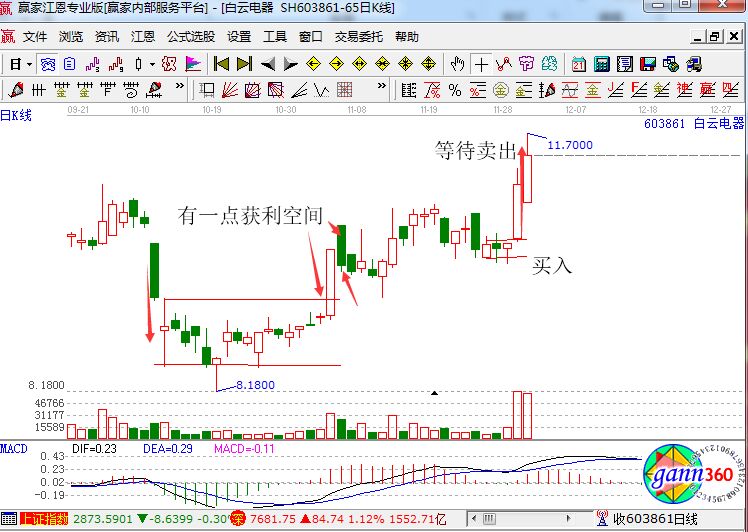如上圖所示,這是白云電器近期的走勢(shì)圖,從圖中我們可以看到,在2018年11月23日的時(shí)候,出現(xiàn)了一次大跌,之后連續(xù)三天都出現(xiàn)了小陰陽(yáng)線進(jìn)行整理,形成了一個(gè)碗底,之后在11月29日出現(xiàn)一個(gè)大陽(yáng)線使得碗口形態(tài)真正形成,如果能在剛出現(xiàn)陽(yáng)線突破碗底整理平臺(tái)時(shí)買入,兩天能收獲不少漲幅,之后也可能有一定的獲利空間。