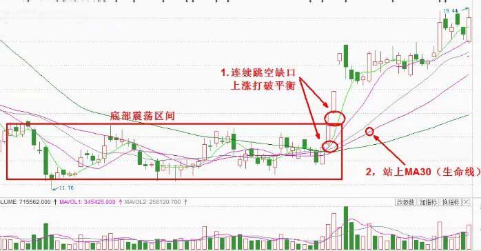 朋友們需要注意的是連續(xù)跳空缺口,即上攻的K線并不一定是漲停板,陽線就可以,需要站上30日均線。
