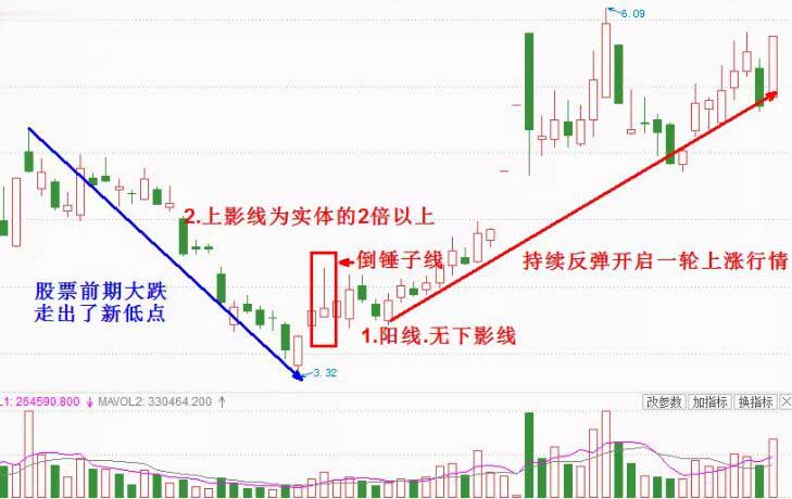2、 倒錘子線最好實體為陽線最佳,當日個股情況也可以是陰線。