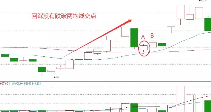我們通過觀察可以看到雖然陰線實(shí)體較大,但是下方的量能并沒有出現(xiàn)明顯放大,同時(shí)大陰線出現(xiàn)之后,也并沒有跌破55日均線支撐,隨后第二天A點(diǎn)在回踩兩條均線交點(diǎn)后出現(xiàn)上漲行情,隨后B點(diǎn)走出溫和放量上漲的走勢(shì),緊接著又是一根縮量回踩均線不破的小實(shí)體陰線,我們基本就可以判定后期上漲趨勢(shì)形成,這時(shí)候我們就應(yīng)該積極進(jìn)場(chǎng)。關(guān)于其他類型的,就不在進(jìn)行一一的介紹了。大家可以自行研究。
