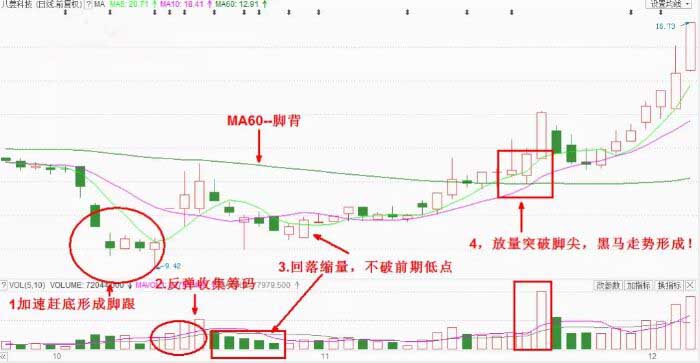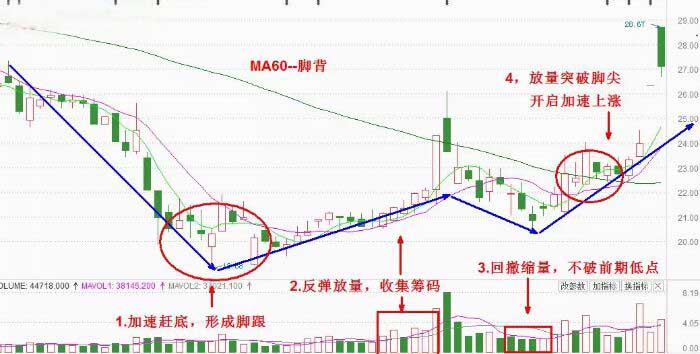 研究莊股,就會發(fā)現(xiàn)一個(gè)規(guī)律,即:莊家往往在下跌后期有一個(gè)加速趕底的動作,快速跌到底部后就形成了腳跟,因?yàn)榭焖傧碌笥蟹磸?,反彈到中長期均線處必然是會遇阻回落的,之后股價(jià)在中長期均線的壓制下逐步的走低,此時(shí)的中長均線就像腳背,股價(jià)的回落能夠不創(chuàng)新低。