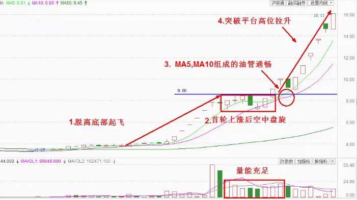2、 5日均線和10日均線一上一下,形成油管,上漲過程。