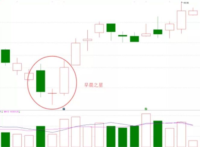 1、 早晨之星。它出現(xiàn)在下跌途中,由3根K線組成,陰線+十字星+陽(yáng)線,陽(yáng)線實(shí)體深入到陰線中,同時(shí)有看漲信號(hào)的意義,如下圖所示。