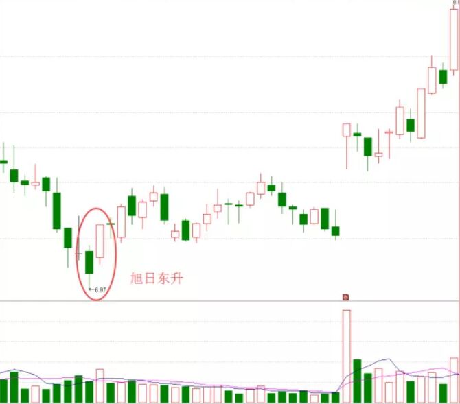 3、旭日東升。此形態(tài)出現(xiàn)在下跌途中,有兩根K線組成,是喲中陰線加上高開(kāi)中陽(yáng)線組成,并且陽(yáng)線收盤(pán)價(jià)高于陰線開(kāi)盤(pán)價(jià),這樣的走勢(shì)就有看漲的意義,如下圖所示。