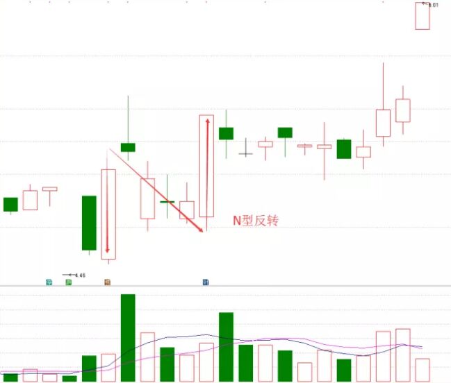 5、N型反轉(zhuǎn)。此形態(tài)出現(xiàn)在上漲的途中,是由大小不等的多根K線所組成,即大陽(yáng)線加上若干小陰線在加上大陽(yáng)線所組成?;卣{(diào)陽(yáng)線組沒(méi)有跌破第一根陽(yáng)線開(kāi)盤(pán)價(jià),具有看漲意義,如下面的圖形所示。