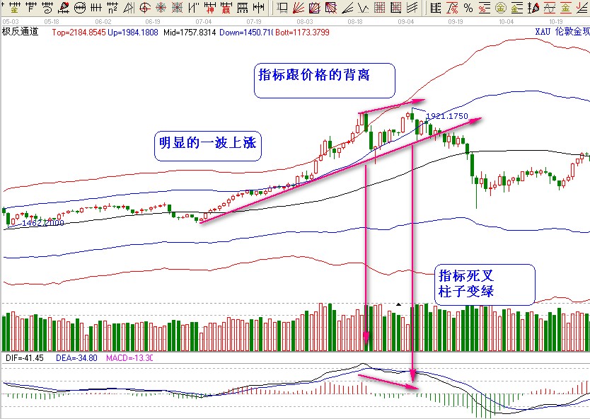 看下面的圖可以看出;指標背離 死叉賣出,細節(jié)問題就是 必須有一段原有的上升趨勢。破了趨勢線也就是破了極反通道上軌的位置,最佳賣出位置,沒有賣到最佳的點位,但是吃到了最安全最大的利率。
