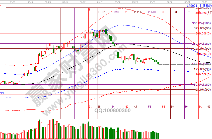 江恩理論中有一條分析規(guī)則四次遇阻力(支撐)而破,價格分析中波段百分比延伸線1倍循環(huán)180度2834點(diǎn),指數(shù)按規(guī)則第四次觸碰時擊破,結(jié)合趨勢判斷,極反通道藍(lán)色下軌線是止跌重要參考線。按歷史規(guī)律,市場不同階段的重要拐點(diǎn)均在極反通道5條線上,盤中擊破2834點(diǎn)時,贏家江恩技術(shù)服務(wù)團(tuán)隊(duì)在VIP學(xué)員群中談到,4月22號提示風(fēng)險帶領(lǐng)大家減倉轉(zhuǎn)入休息,5月份二次在2840點(diǎn)是高風(fēng)險者分批博弈,應(yīng)用區(qū)間交易法均獲得利潤。市場下破2834點(diǎn),延續(xù)調(diào)整是低風(fēng)險者空倉或輕倉者的機(jī)會,市場走勢是有規(guī)律可循,而贏家江恩系統(tǒng)中極反通道就是一個直觀、有效的判勢工具,用規(guī)則紀(jì)律行事,買在支撐賣在壓力。本周是周線、日線時間窗口共振時間段,跟隨市場觀察是否與價格形成時價四方共振,6月10號盤中壓力是315度2844點(diǎn)、0度2860點(diǎn),盤中支撐是180度2800、135度2786點(diǎn)。操作策略,指數(shù)擊破黑色生命線進(jìn)入弱勢區(qū)域,整體持倉保持在3-4成,做到進(jìn)可攻退可守。