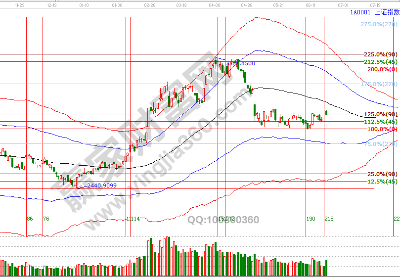 大盤跳空脫離近幾日持續(xù)談到的關(guān)鍵位,盤中最高沖擊至第一目標(biāo)位2950點(diǎn),回顧近期思路,10號(hào)早盤收復(fù)2840點(diǎn)按照規(guī)則開倉(cāng),2880-2890為持倉(cāng)關(guān)鍵位,連續(xù)三個(gè)交易日收盤關(guān)鍵位,分析的觀點(diǎn)是不破延續(xù)反彈,今天盤中到達(dá)第一目標(biāo)位后,按規(guī)則賣在壓力,5成倉(cāng)或以上者可以獲利部分籌碼,剩余倉(cāng)位繼續(xù)持有,未來(lái)幾天關(guān)注江恩價(jià)格四方形與百分比延伸線2911-2900點(diǎn),此區(qū)間震蕩不破延續(xù)震蕩反彈動(dòng)作。6月20號(hào)盤中壓力是225度2944點(diǎn)、180度2928點(diǎn),盤中支撐是90度2894點(diǎn)。操作策略,指數(shù)處于極反通道弱勢(shì)區(qū)域的反彈走勢(shì),繼續(xù)關(guān)注2911-2900區(qū)間不破延續(xù)反彈,整體持倉(cāng)保持3成左右。
