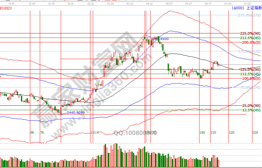 市場走勢同20號分析一致,圍繞日線極反通道黑色生命線上下震蕩,按歷史規(guī)律,自下向上的突破生命線需要量能及3天時間確認,指數(shù)收盤價一直在生命線上,不足之處是量能出現(xiàn)持續(xù)萎縮,27號江恩時間窗口盤中關(guān)鍵位2966點,結(jié)合周期關(guān)系,整體還處于反彈周期內(nèi),6月27號盤中壓力是0度2997點、45度3016點,盤中支撐是2966點、2944點。操作策略,指數(shù)圍繞極反通道生命線震蕩,延續(xù)反彈走勢中,整體持倉保持3-5左右,7月3號時間窗口選擇方向。