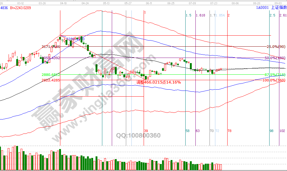 26號指數(shù)收盤正好在江恩價格四方形測算的2944點,保持在極反通道生命線2927點上安全區(qū)域運行,外因與場內(nèi)資金不活躍兩因素,同時上攻期將逐步遇藍色上軌線反壓力,按時間、空間循環(huán)判斷,維持24號觀點,波段百分比240度2878點支撐,向上反攻第一目標(biāo)是0度2966點,第二目標(biāo)是60分鐘藍色上軌線,運行時間周期為8月1號。7月29號盤中壓力是270度2961點、315度2978點,盤中支撐是180度2928點、135度2911點。操作策略,指數(shù)極反通道生命線震蕩,信號延續(xù)價格目標(biāo)看60分鐘上軌線,時間周期看8月1號,信號結(jié)束為上證50失守60分鐘生命線,整體持倉保持3成。