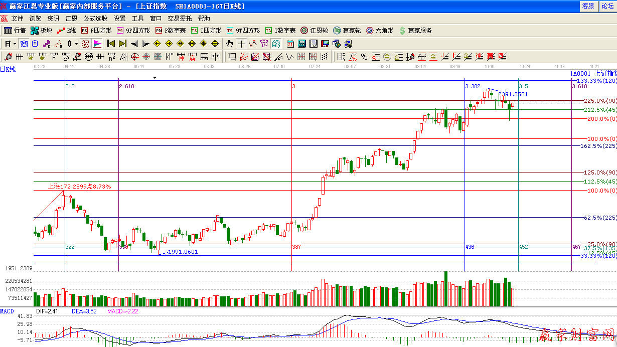 江恩看盤綜述:依據(jù)贏家江恩技術(shù)工具分析得出:今日上證指數(shù)回探江恩45度2340點后,震蕩反彈,以小陽線報 收,市場整體進入維穩(wěn)期,由于今日反彈量能萎縮明顯,短期不排除震蕩反復(fù)走勢,下以時間窗口在22日。預(yù)計將會明確方向。操作上,適當控制倉位,投資者可適當挖掘低價藍籌股的補漲機會。