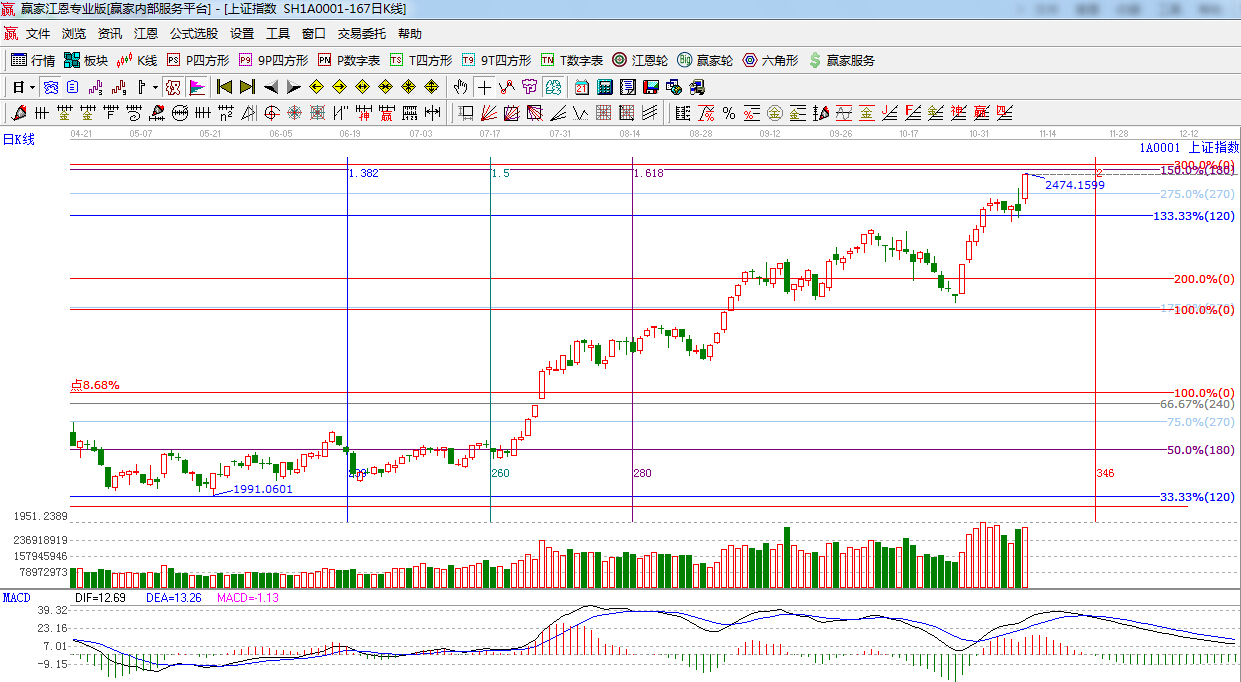 ☆依據(jù)贏家江恩系統(tǒng)黃金時間周期線提示:重點關注時間窗口是11月24日。