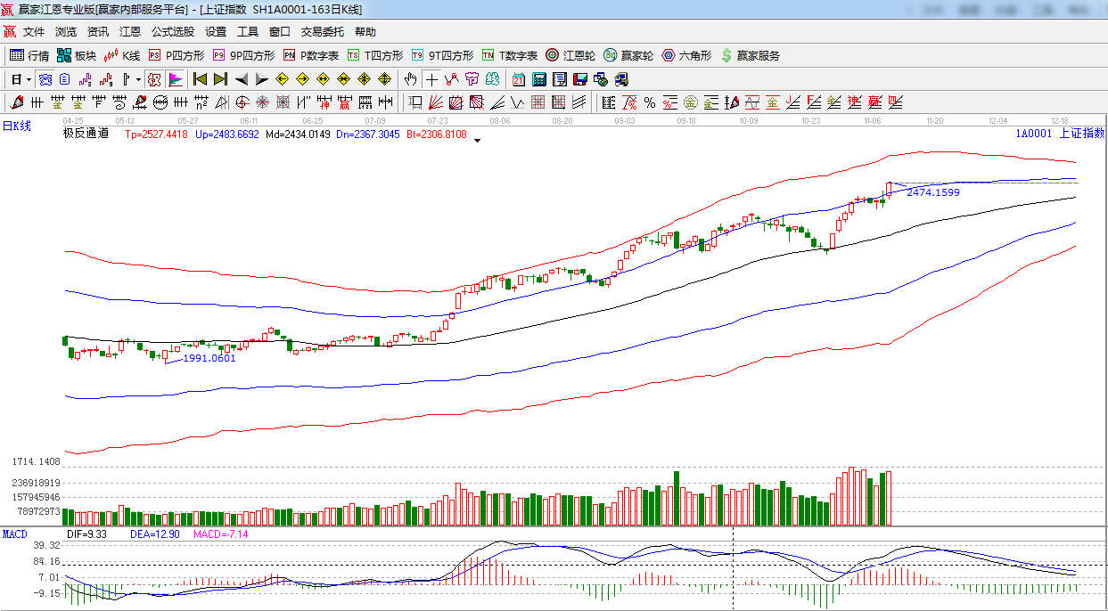 盤面上,受APEC會議確定的重磅利好,金融股和“一帶一路”相關概念大幅飆升,通用航空、醫(yī)療器械,大飛機等板塊跌幅靠前,目前上證指數(shù)仍然處在強勢狀態(tài)中,相比之下,創(chuàng)業(yè)板小幅回落,技術面,明日需關注上方即將面臨的江恩180度2480點-2489點阻力,預計周二大盤維持高位震蕩的走勢。