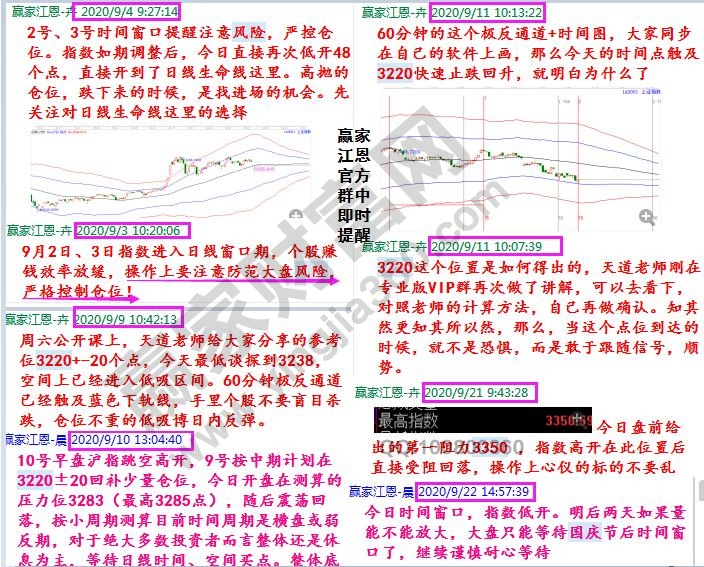 2020年一季度大盤反復(fù)摔打創(chuàng)年內(nèi)低點(diǎn)2646點(diǎn)、二季度小碎步攀升、三季度強(qiáng)勢(shì)上攻隨后轉(zhuǎn)入修整,四季度行情拉開序幕、蓄勢(shì)待發(fā)。8、9月份市場(chǎng)在箱體區(qū)間內(nèi)運(yùn)行,贏家江恩團(tuán)隊(duì)在正式學(xué)員群提前給出箱體策略,原話如下“在一個(gè)箱體區(qū)間里做滾動(dòng)交易--底倉+活動(dòng)倉,不會(huì)輕易的去追漲,而是對(duì)持續(xù)跟蹤的標(biāo)的(日或周強(qiáng)勢(shì)區(qū)域)調(diào)整幾天后用活動(dòng)倉參于,上漲到別人想追時(shí)賣出?!?/span>學(xué)員可在群中搜索“箱體”回顧提出時(shí)間進(jìn)行思考,為何能提前于市場(chǎng)走勢(shì)之前就提出相應(yīng)的策略?當(dāng)你你又是如何打算的呢?后知后覺者永遠(yuǎn)是賣單者,大家看看自己的賬戶,是不是9月份把今年賺的都還給市場(chǎng)了,其中應(yīng)該不少人8月份就還了利潤(rùn),9月份還虧了本金。如這樣都不能讓你明白,擁有一套“投資體系”的重要性,那再來一波牛市,賺的錢最終也不是你的。如果你跟隨專業(yè)的團(tuán)隊(duì)進(jìn)行學(xué)習(xí),在9月初2號(hào)、3號(hào)時(shí)間窗口,提醒降低倉位時(shí)控制倉位,不僅保住了利潤(rùn)還可以根據(jù)工具信號(hào)在9月11日3220時(shí)價(jià)點(diǎn)做一個(gè)反彈,同樣贏家江恩團(tuán)隊(duì)提前測(cè)算出3350壓力,9月底指數(shù)再探3200附近,分鐘圖再現(xiàn)時(shí)價(jià)四方信號(hào)。