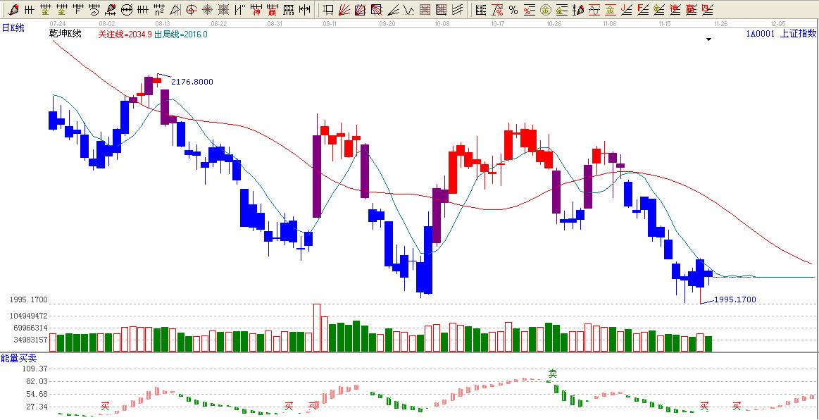 ☆依據(jù)贏家江恩系統(tǒng)乾坤k線提示:大盤還是處于藍(lán)色區(qū)域,看空信號(hào)。