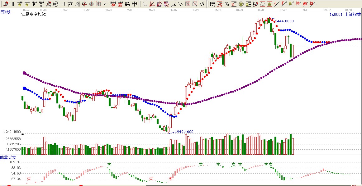 ★依據(jù)贏家江恩多空戰(zhàn)線提示:目前大盤運(yùn)行在長(zhǎng)期紫色多空線附近,短期藍(lán)色線上方,謹(jǐn)慎做多。