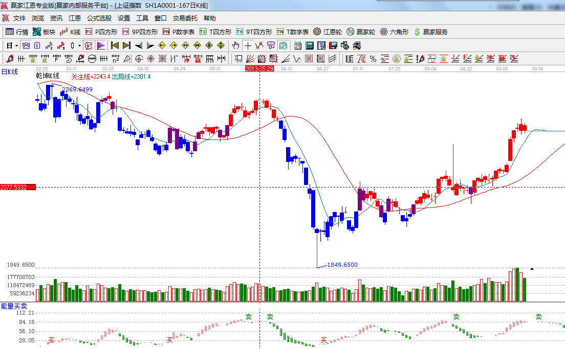 ☆依據(jù)贏家江恩系統(tǒng)波段百分比延伸提示:2255點是百分比240度位置受阻回落,短期調(diào)整目標位是315度2197位置;(2)