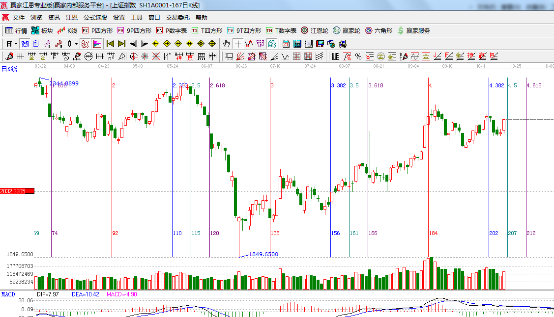 ☆依據(jù)贏家江恩系統(tǒng)波段百分比延伸提示:240度位置2255是上方百分比線;