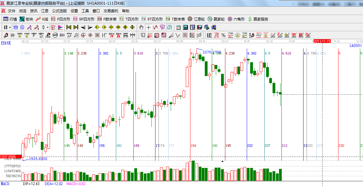 ★依據(jù)贏家江恩系統(tǒng)波段百分比延伸提示:江恩百分比45度是2125;