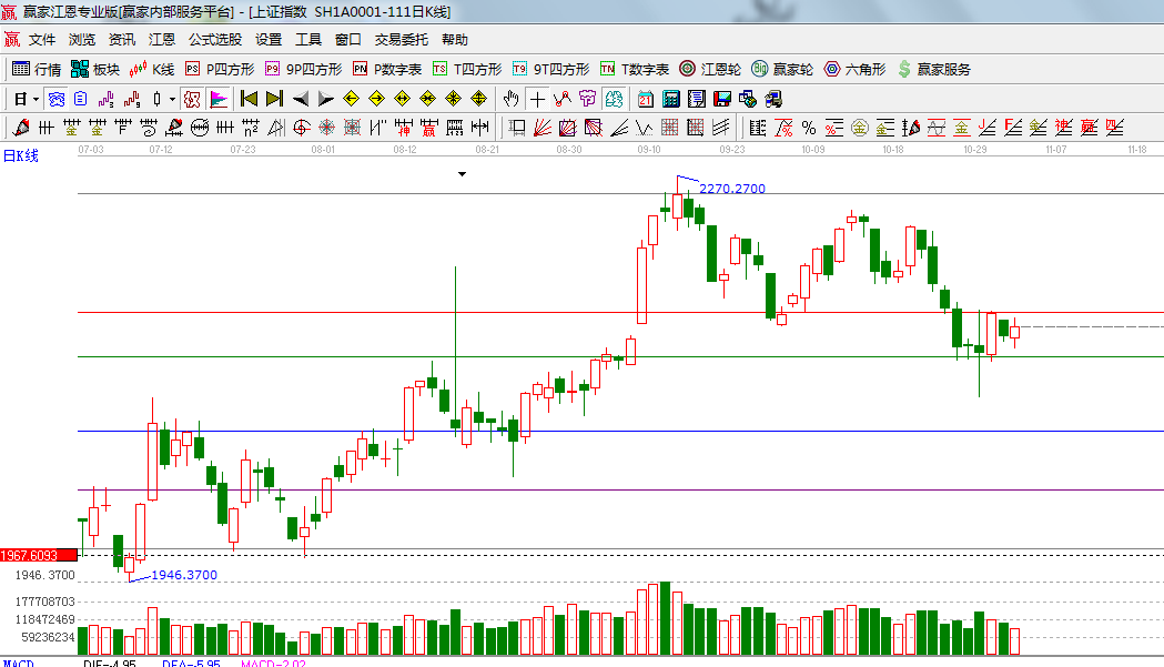 ☆依據(jù)贏家江恩系統(tǒng)乾坤K線提示: K線收盤價(jià)在短期出局線上,震蕩不破出局線短期會(huì)反抽紅色關(guān)注線,趨勢(shì)而言藍(lán)色休息區(qū)以保守操作或空倉為主;