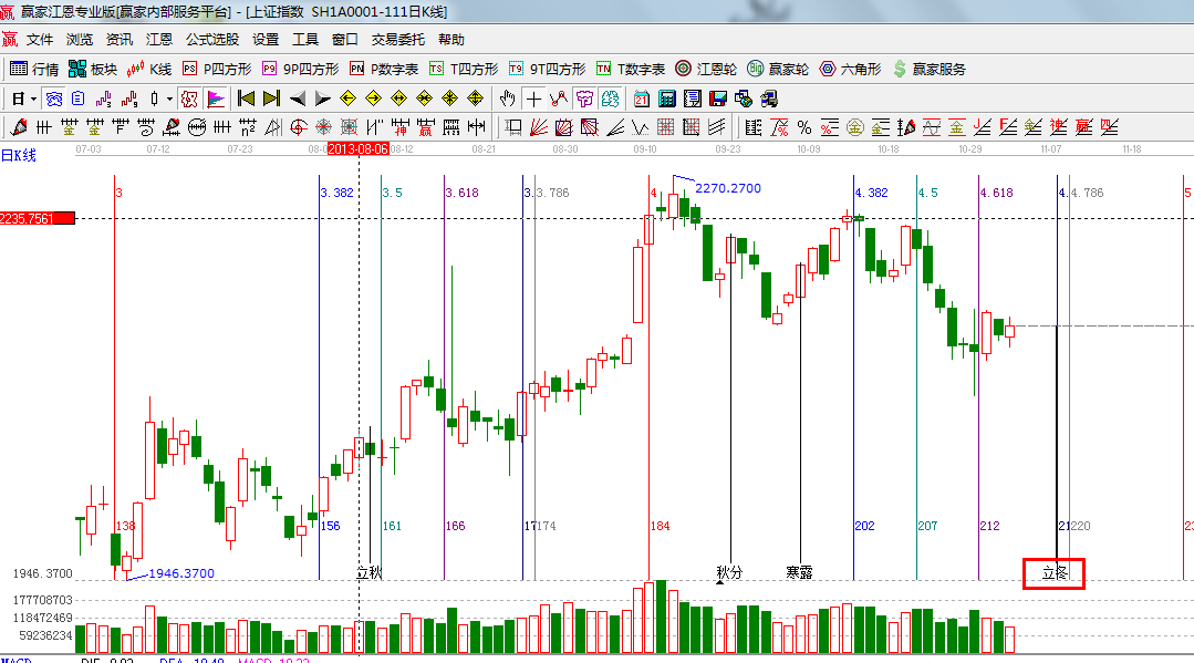 ★依據(jù)贏家江恩系統(tǒng)黃金時(shí)間周期線提示:7號(hào)、8號(hào)為日線時(shí)間窗,同時(shí)24節(jié)氣立冬是7號(hào);