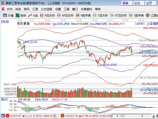 咨詢:13333833889周二大盤低開(kāi)震蕩小漲0.35%,幾大指數(shù)全線小漲,午盤創(chuàng)業(yè)板帶領(lǐng)下震蕩攀升。板塊方面,鋼鐵、煤炭和有色領(lǐng)漲,家電、銀行、石油、券商等下跌;題材方面,圍繞漲價(jià)、中報(bào)預(yù)增、一帶一路幾個(gè)方面,開(kāi)板新股和一些高位白馬股走勢(shì)相對(duì)較弱,個(gè)股上漲居多,成交量同前期7月中上旬持平。技術(shù)方面,除日線外15、30、60均跌破極反通道生命線,短期生命線在3197附近為今日盤中阻力點(diǎn),日線震蕩后還有回踩生命線的概率,擇時(shí)在將7月6號(hào)附近減的籌碼回補(bǔ),當(dāng)前策略就是等待,倉(cāng)位保持在4成,3174、3158為日內(nèi)支撐,3197、3202為日內(nèi)阻力,僅供參考,不構(gòu)成任何投資建議。