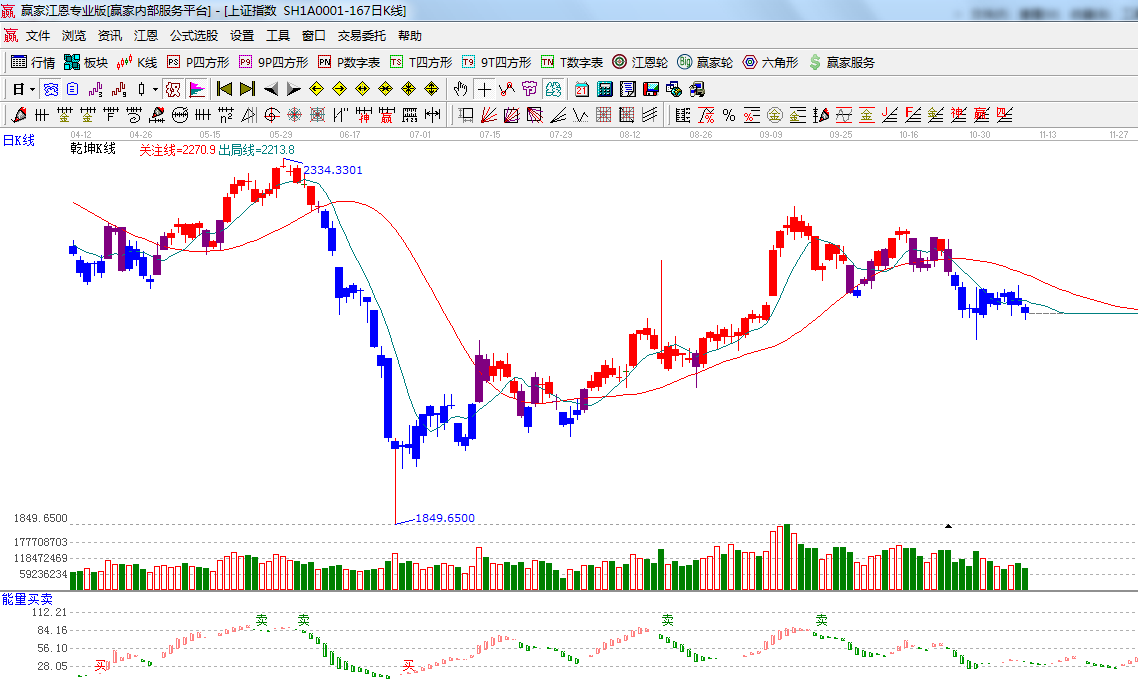 ☆依據(jù)贏家江恩系統(tǒng)乾坤K線提示:藍色K線為休息區(qū),跌破短期出局線反抽概率減小;