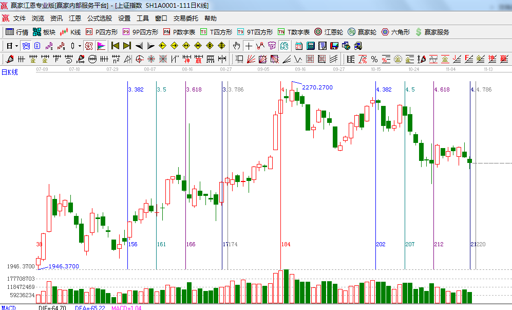 ★依據(jù)贏家江恩系統(tǒng)波段百分比延伸提示:江恩理論百分比45度位置是2125點,江恩百分比0度是2160;