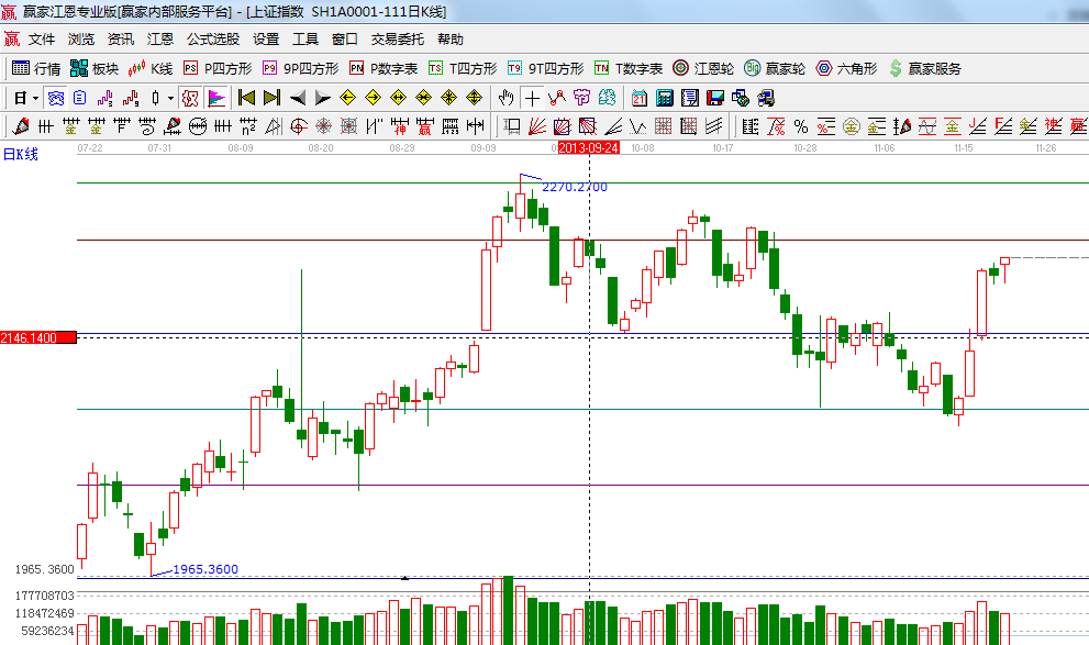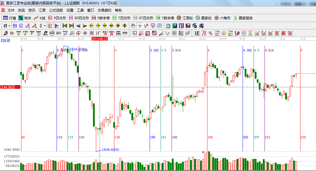 ☆依據(jù)贏家江恩系統(tǒng)波段百分比延伸提示:黃金分割價(jià)格圖0.236位置是2219點(diǎn),0.382位置是2050點(diǎn);