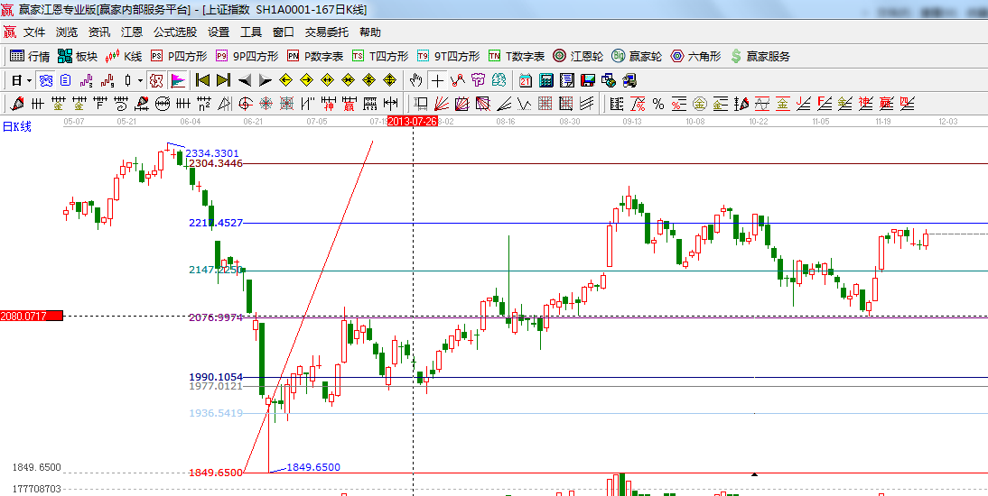 ☆依據(jù)贏家江恩系統(tǒng)波段百分比延伸提示:2444與1849點(diǎn)做黃金分割價(jià)格圖,0.382位置是2217點(diǎn),0.5位置是2150點(diǎn);