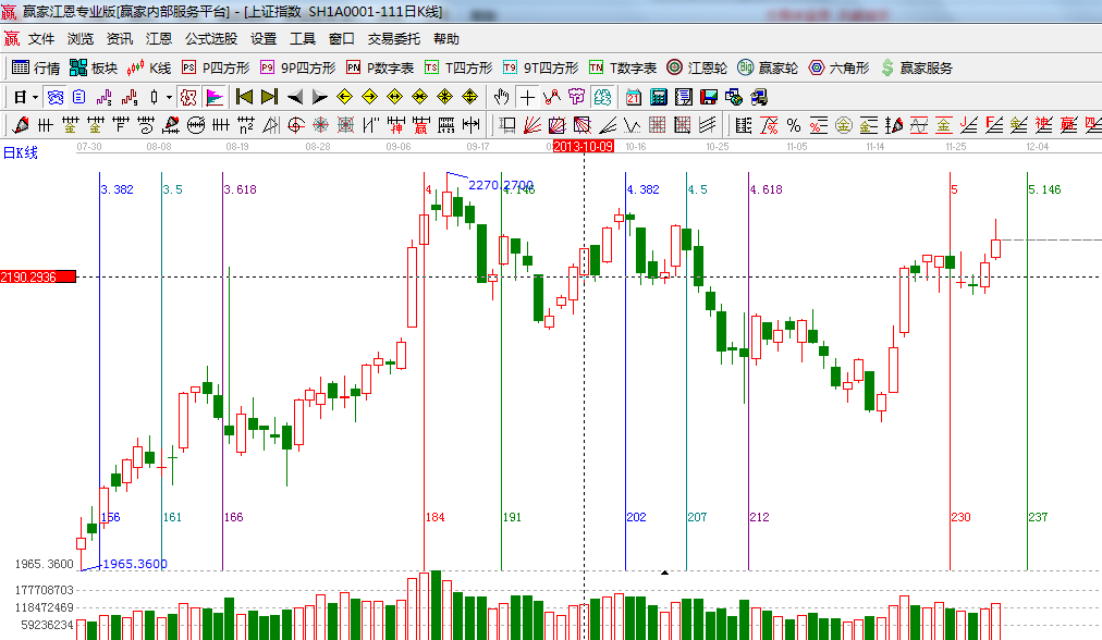 ☆依據(jù)贏家江恩系統(tǒng)波段百分比延伸提示:2444與1849點(diǎn)做黃金分割價(jià)格圖,0.382位置是2217點(diǎn),上方拋壓在前期頭部2265附近;