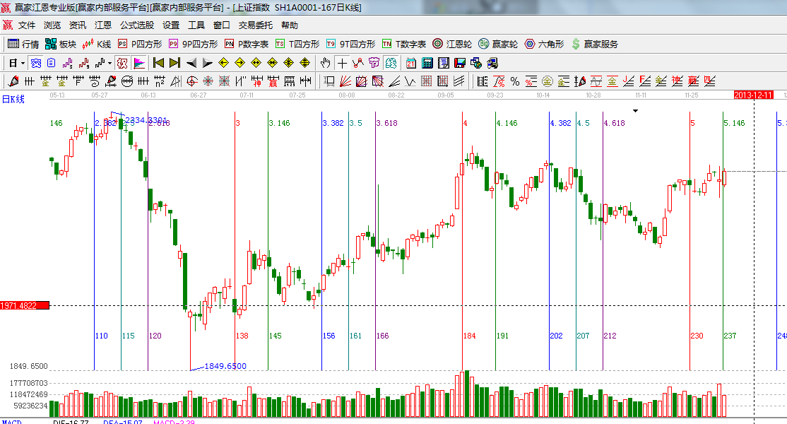 ☆依據(jù)贏家江恩系統(tǒng)波段百分比延伸提示:2444與1849點(diǎn)做黃金分割價(jià)格圖,0.382位置是2217點(diǎn),下方支撐為0.5位置2150,上方拋壓在前期頭部2265附近;