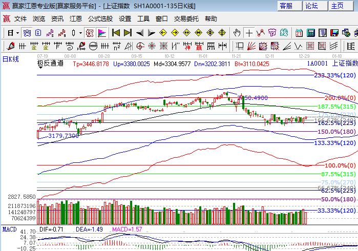 滬指上周五震蕩小漲,權(quán)重操控全天處于經(jīng)盤狀態(tài),深市幾大指數(shù)走勢相對強(qiáng)于滬指。板塊方面,地產(chǎn)、銀行領(lǐng)漲貢獻(xiàn)最大,周四表現(xiàn)的白馬股保險(xiǎn)、釀酒等領(lǐng)跌;題材方面,芯片、蘋果、維生素概念領(lǐng)漲,次新、高送轉(zhuǎn)概念較弱,個(gè)股上漲居多但分化依然嚴(yán)重,成交量較前日萎縮。技術(shù)方面,滬指17年收官K線走勢不錯(cuò),周、月K線都在極反通道生命線上,日線維持在江恩百分比225度與270度3272點(diǎn)、3320區(qū)間震蕩,短周期15、30、60分鐘在生命線上附近運(yùn)行,15分鐘外軌線與百分比270度在同一位置,盤中上攻時(shí)注意此位置壓力,本周已然是周線的時(shí)間點(diǎn),向上重點(diǎn)看日線生命線,持股心態(tài)漲不喜跌不悲。上證50關(guān)注日線生命線2850點(diǎn)得失,創(chuàng)業(yè)板120度與135度構(gòu)造平臺。操作策略上波段4成倉持股不動,3288、3272為日內(nèi)支撐,3308、3321為日內(nèi)壓力。僅供參考,不構(gòu)成任何投資建議。