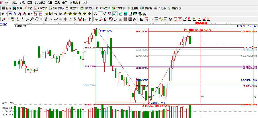 ★依據(jù)贏家江恩理論系統(tǒng)江恩波段百分比提示:滬指在創(chuàng)日線新高,短線支撐依舊是3401點(diǎn),以及240度3380附近。