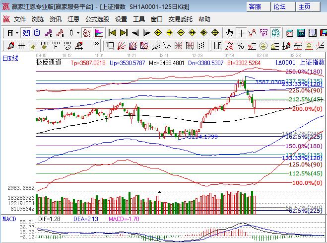 上周五大盤大幅低開下探一度跌破3400點后展開回抽,尾盤在石油帶動下翻紅,深市幾大指數全線小漲。板塊方面,周期股煤炭、鋼鐵、有色、石油、建材等板塊領漲,環(huán)保、釀酒等領跌,題材無明顯表現,次新、海南本地、高送轉和ST等領跌,個股下跌居多,跌停板多達60家,成交量較前日萎縮。技術方面,滬指日線最低基本探至極反通道生命線位置,K線懸空可上可下位置,江恩百分比2倍零度位置3420點與生命線構造支撐區(qū)間,45度(3470點)與外軌線位置(3510點)構成阻力區(qū)間,預計節(jié)前滬指將在此區(qū)間內震蕩;創(chuàng)業(yè)板下挫再度試探趨勢線位置后反抽,前期低點1641點附近會有反復;上證50主線品種強勢,此指數調整空間有限。市場正在構造中期箱體,操作上不追高,從銀行、地產、化工、周期股輪換中尋找低吸機會。倉位中長線4成倉持股不動,3420、3430為日內支撐,3470、3480為日內壓力。僅供參考,不構成任何投資建議。