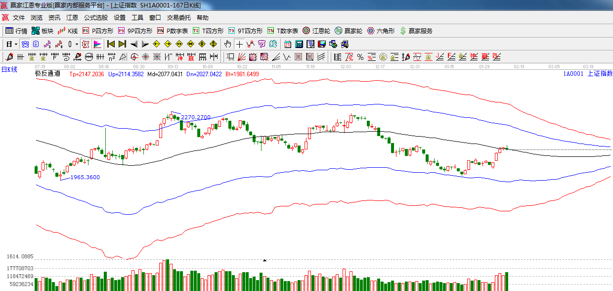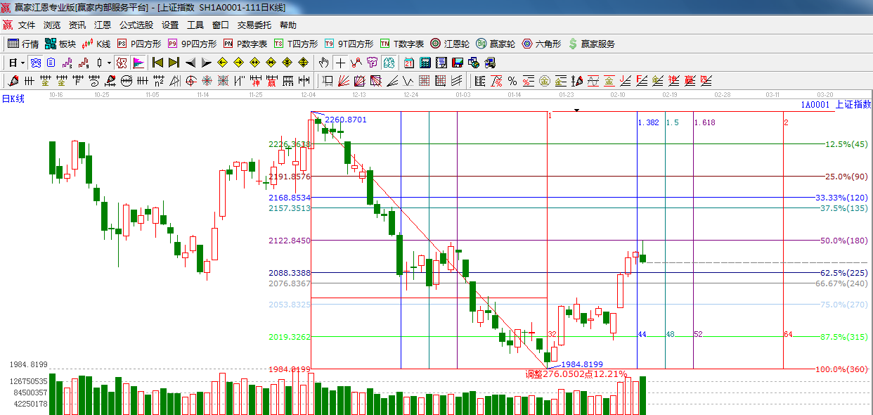 ☆ 依據(jù)贏家江恩系統(tǒng)黃金時間周期線提示:今日是前幾天提到的時間窗口,指數(shù)沖高回落,收倒垂頭線,短期注意風險,下一個江恩時間窗口是2月18日(黃金時間1.5的時間窗口)。