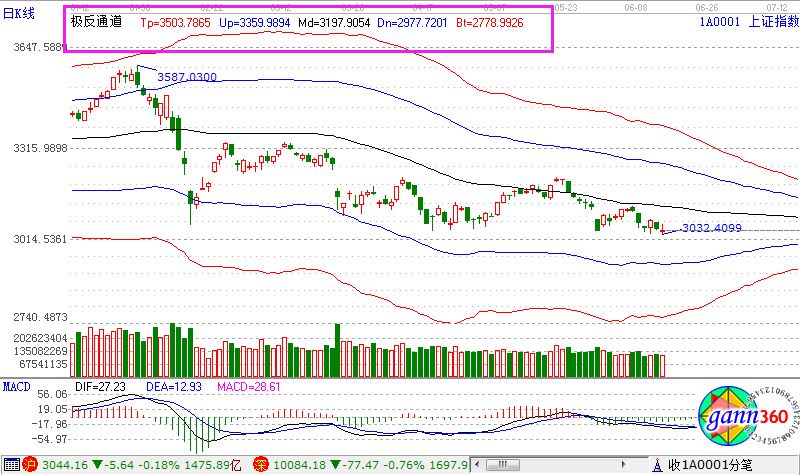 滬指跌0.18%,報收3044點;深成指跌0.76%,報收10084點;創(chuàng)業(yè)板跌0.75%,報收1673點。盤面上看,鋼鐵、稀土永磁、水泥、煤炭、證券、集成電路等板塊上漲;足球概念、白酒、新疆振興、互聯(lián)網彩票、家用電器等板塊下跌。全天,滬股通凈流入19億元,深股通凈流入10億元。相應的極反通道指標的支撐壓力提示,如下圖所示: