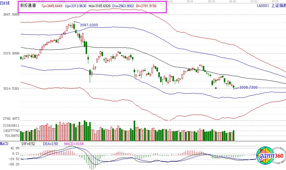 滬指跌0.73%,報收3021點;深成指跌1.40%,報收9943點;創(chuàng)業(yè)板跌1.89%,報收1641點。盤面上看,煤炭、銀行、粵港澳自貿(mào)區(qū)等少數(shù)板塊上漲;石油、啤酒、海南、知識產(chǎn)權(quán)保護(hù)、生態(tài)農(nóng)業(yè)、服裝紡織等板塊下跌。全天,滬股通凈流入22億元,深股通凈流入6億元。相應(yīng)的極反通道指標(biāo)的支撐壓力提示,如下圖所示: