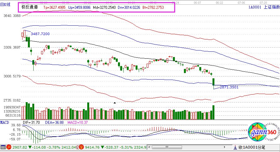 滬指跌3.78%,報(bào)收2907點(diǎn);深成指跌5.31%,報(bào)收9414點(diǎn);創(chuàng)業(yè)板跌5.76%,報(bào)收1547點(diǎn)。盤(pán)面上看,鈦白粉、通信技術(shù)、造紙、特鋼、自由貿(mào)易港、知識(shí)產(chǎn)權(quán)保護(hù)、CDR概念等板塊跌幅居前。全天,滬股通凈流出19億元,深股通凈流出900萬(wàn)元。相應(yīng)的極反通道指標(biāo)的支撐壓力提示,如下圖所示: