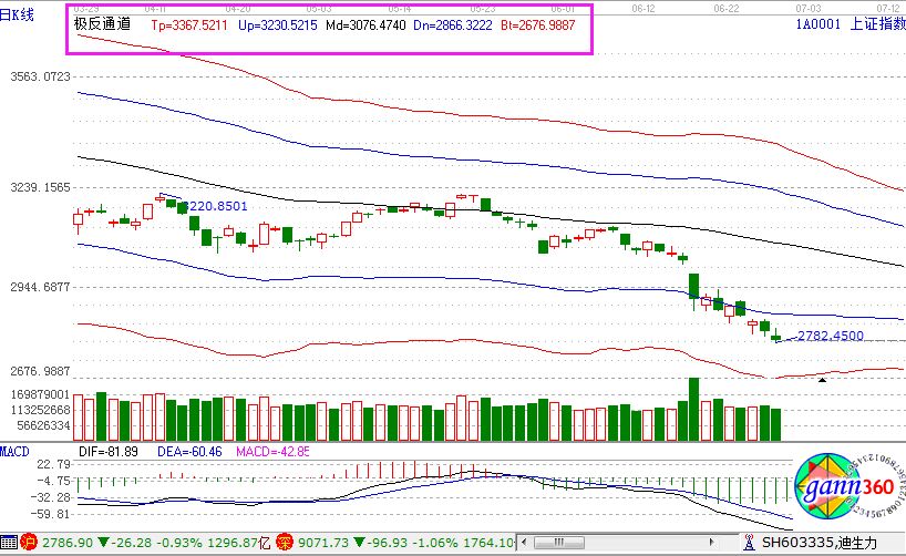 滬指跌0.93%,報收2786點;深成指跌1.06%,報收9071點;創(chuàng)業(yè)板跌0.17%,報收1543點。從盤面上看,證券、石油開采、高送轉(zhuǎn)、5G、景點及旅游、紡織制造等板塊漲幅居前;百度概念、分散染料、互聯(lián)網(wǎng)彩票、農(nóng)業(yè)服務、養(yǎng)殖業(yè)、獨角獸概念等板塊跌幅居前。滬股通凈流入22億,深股通凈流出13億。相應的極反通道指標的支撐壓力提示,如下圖所示: