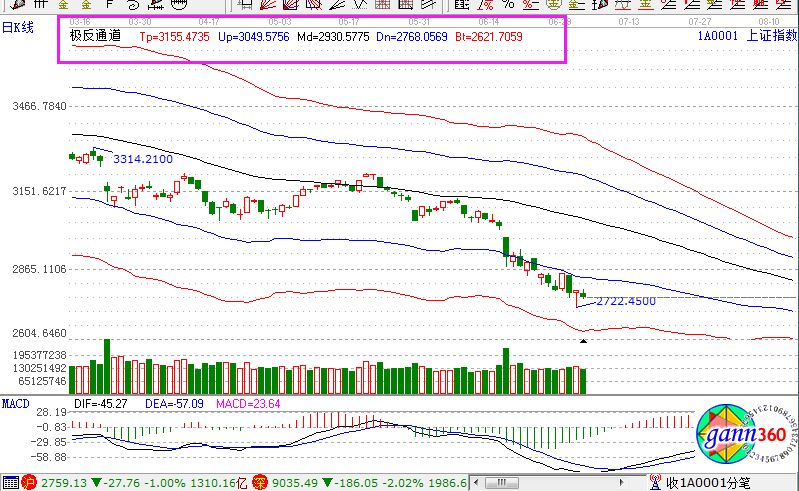 滬指跌1.00%,報2759點;深成指跌2.02%,報9035點;創(chuàng)業(yè)板指跌2.58%,報1565點。盤面上看,機場航運、鋼鐵、黃金、農(nóng)林牧漁、深圳國資改革等板塊漲幅居前;次新股、網(wǎng)絡(luò)安全、海南、紡織制造、數(shù)字中國、人臉識別等板塊跌幅居前。滬股通凈流出2.8億,深股通凈流出10億。相應(yīng)的極反通道指標(biāo)的支撐壓力提示,如下圖所示: