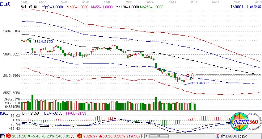 滬指跌0.23%,報(bào)收2831.18點(diǎn);深成指漲0.58%,報(bào)收9326.97點(diǎn);創(chuàng)業(yè)板漲0.24%,報(bào)收1618.46點(diǎn)。從板塊漲幅上看,白酒、飲料、醫(yī)藥等漲幅居前;農(nóng)林、紡織、計(jì)算機(jī)、軍工等跌幅居前。相應(yīng)的極反通道指標(biāo)的支撐壓力提示,如下圖所示: