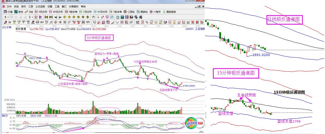江恩看盤綜述:通過(guò)贏家江恩系統(tǒng)趨勢(shì)、時(shí)間、價(jià)格工具綜合評(píng)判市場(chǎng)一星看多(五星評(píng)級(jí)標(biāo)準(zhǔn))。滬指日線依托極反通道藍(lán)線下軌線震蕩,7月6號(hào)最低點(diǎn)2691點(diǎn)對(duì)應(yīng)的是月線藍(lán)色下軌線,周線藍(lán)色下軌線是2640附近,周、月線的下軌線走平,在一定程度上限制了下行的空間;短周期15、30、60分鐘均處于生命線下弱勢(shì)通道,單從K線位置而言,懸空可上可下狀態(tài),20號(hào)早盤11點(diǎn)是日內(nèi)時(shí)間窗,15分鐘生命線是2787點(diǎn),對(duì)應(yīng)藍(lán)色下軌線中2750附近,明日觀察時(shí)間窗與價(jià)格的有關(guān)系,遵循線上支撐線下阻力原則。