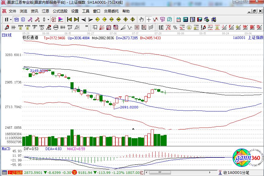 滬指跌0.16%,報收2870點;深成指跌1.23%,報收9181點;創(chuàng)業(yè)板跌2.19%,報收1559點。從盤面上看,油改、高鐵、水泥、鋼鐵、銀行、化工新材料等板塊漲幅居前;西藏、醫(yī)療器械、基因測序、無人零售、海南板塊等板塊跌幅居前。滬股通凈流入25億,深股通凈流入1.4億。相應(yīng)的極反通道指標(biāo)的支撐壓力提示,如下圖所示: