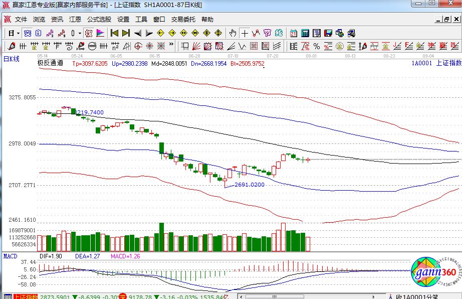 滬指漲0.26%,報2876點;深成指跌0.03%,報9178點;創(chuàng)業(yè)板指漲0.10%,報1561點。盤面上看,國企改革、石油采掘、二胎概念、租售同權等板塊漲幅居前;深圳國資改革、鋼鐵、軍工、水泥、化工新材料、煤炭等板塊跌幅居前。滬股通凈流入19億,深股通凈流入13億。相應的極反通道指標的支撐壓力提示,如下圖所示: