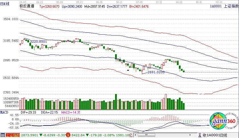 滬指跌1.29%,報(bào)2705點(diǎn);深成指跌2.08%,報(bào)8422點(diǎn);創(chuàng)業(yè)板指跌2.75%,報(bào)1440點(diǎn)。盤面上看,西安自貿(mào)區(qū)、銀行、鈦白粉等少數(shù)板塊上漲;草甘膦、禽流感、高送轉(zhuǎn)、自由貿(mào)易港、豬肉、次新股、醫(yī)藥電商等板塊跌幅居前。滬股通凈流入15億,深股通凈流入16億。相應(yīng)的極反通道指標(biāo)的支撐壓力提示,如下圖所示: