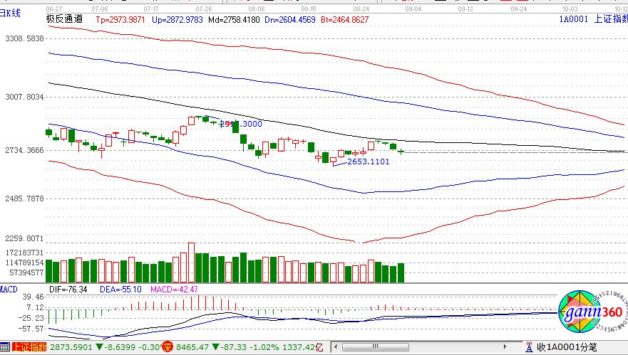 滬指跌0.46%,報收2725點;深成指跌1.02%,報收8465點;創(chuàng)業(yè)板跌1.56%,報收1435點。從盤面上看,知識產(chǎn)權(quán)保護、銀行、地下管網(wǎng)、養(yǎng)殖業(yè)等板塊漲幅幅居前;在線旅游、次新股、電子競技、 ST板塊、白酒、家電等板塊跌幅居前。滬股通凈流入29億,深股通凈流入13億。相應的極反通道指標的支撐壓力提示,如下圖所示:
