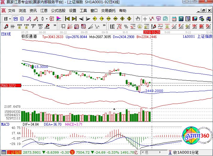 滬指跌0.19%,報(bào)收2598點(diǎn);深成指跌0.33%,報(bào)收7504點(diǎn);創(chuàng)業(yè)板跌0.82%,報(bào)收1263點(diǎn)。從盤面上看,地產(chǎn)股、煤炭、ST、紡織、租售同權(quán)等板塊領(lǐng)漲;證券、保險(xiǎn)、白酒、銀行、食品飲料、醫(yī)藥電商等板塊領(lǐng)跌。滬股通凈流出8億,深股通凈流出7.5億。。相應(yīng)的極反通道指標(biāo)的支撐壓力提示,如下圖所示: