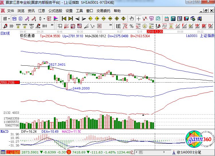 滬指跌1.05%,報收2549點;深成指跌1.48%,報收7418點;創(chuàng)業(yè)板跌1.90%,報收1268點。盤面上看,豬肉、石油、醫(yī)療器械、自由貿(mào)易港、醫(yī)藥電商等板塊跌幅居前。滬股通凈流出6900萬,深股通凈流出4億。相應(yīng)的極反通道指標(biāo)的支撐壓力提示,如下圖所示:
