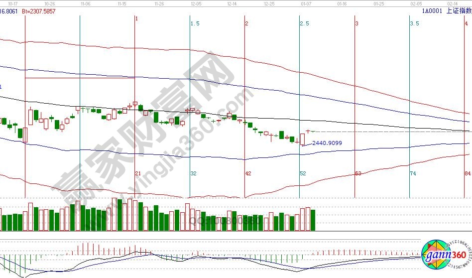 大盤日K線連續(xù)兩天窄幅震蕩,短期橫盤進入方向選擇期,目前依然處于2400點反彈周期內(nèi),9號江恩價格四方形提示,第一支撐45度2516點,第一壓力0度2547點,時間窗口,1月15日、23號為日線時間窗口。操作策略,大盤日線未收復(fù)生命線前波段休息,短線當前處于上漲周期,盤中遇壓力短線高拋,15分鐘生命線2516附近不破,短線逢低做多,本輪短線反彈底線是2478點不破,高度為日線生命線2585附近。